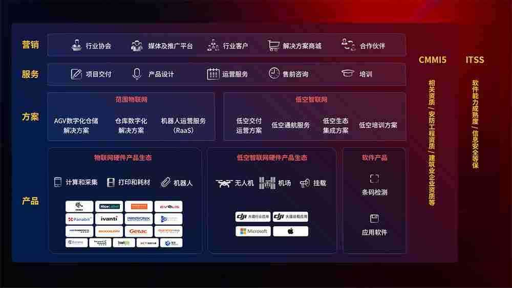 聚合国内外先进的物联网硬件产品品牌,,聚焦数字化仓储、、、机器人运营、、、、低空智联网等领域,,共同打造适合客户业务场景的解决方案并提供交付服务