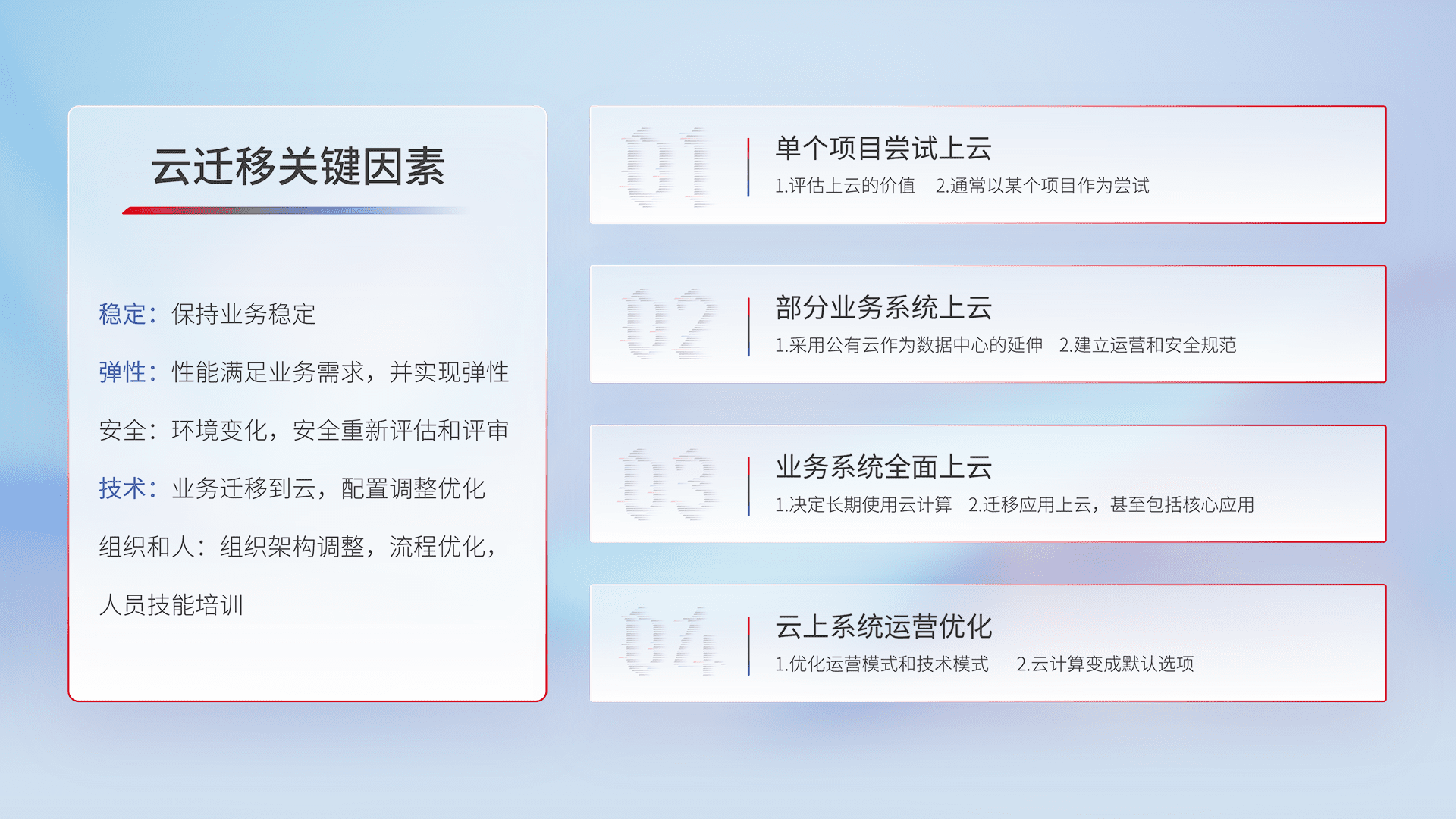 结合实际业务,,从规划设计、、、、云平台选型、、、云原生改造、、、、数据迁移、、、集成交付,,迁移全过程为客户识别最佳上云路径,,,,做好风险识别管理,,,,设计网络架构、、身份权限、、安全审计合规、、操作审计、、、、日志审计、、、监控告警策略、、多站点容灾设计等,,对云上基础设施进行整体规划,,,,提升IT治理水平,,,,以满足弹性、、高可用、、、、高性能的需求。。