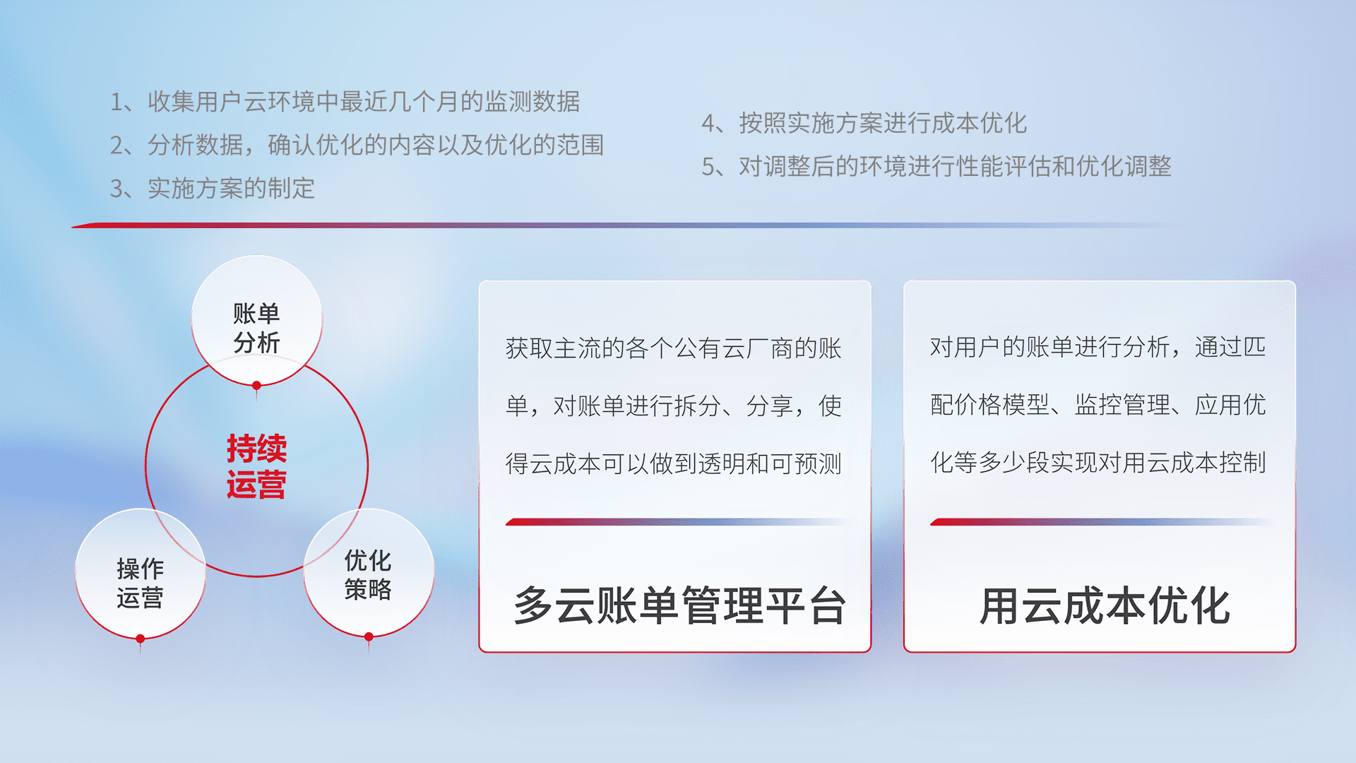 通过多云纳管,,,以统一的资源数据模型把客户的云资源进行抽象和封装,,,,进而实现对多云资源的统一操作,,保障云资源管理的可靠性、、、稳定性与可用性。。量身定制化运维内容,,配置、、、、开发运维、、、、补丁管理、、备份、、监控、、认证和访问管理、、、审计和日常巡检等,,,,保障在用云过程中的可靠度,,稳定度以及高可用率。。。。
