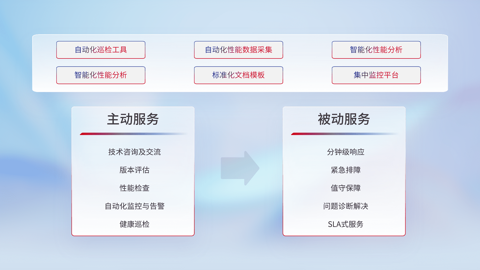 智能化工具和标准化文档,,,,保障服务质量,,,,提供主动服务(包含技术咨询、、、版本评估、、、性能检查、、、、自动化监控与告警、、、、健康巡检)和被动服务包含(分钟级响应、、、紧急排障、、、、值守保障、、、、问题诊断解决、、SLA服务)。。