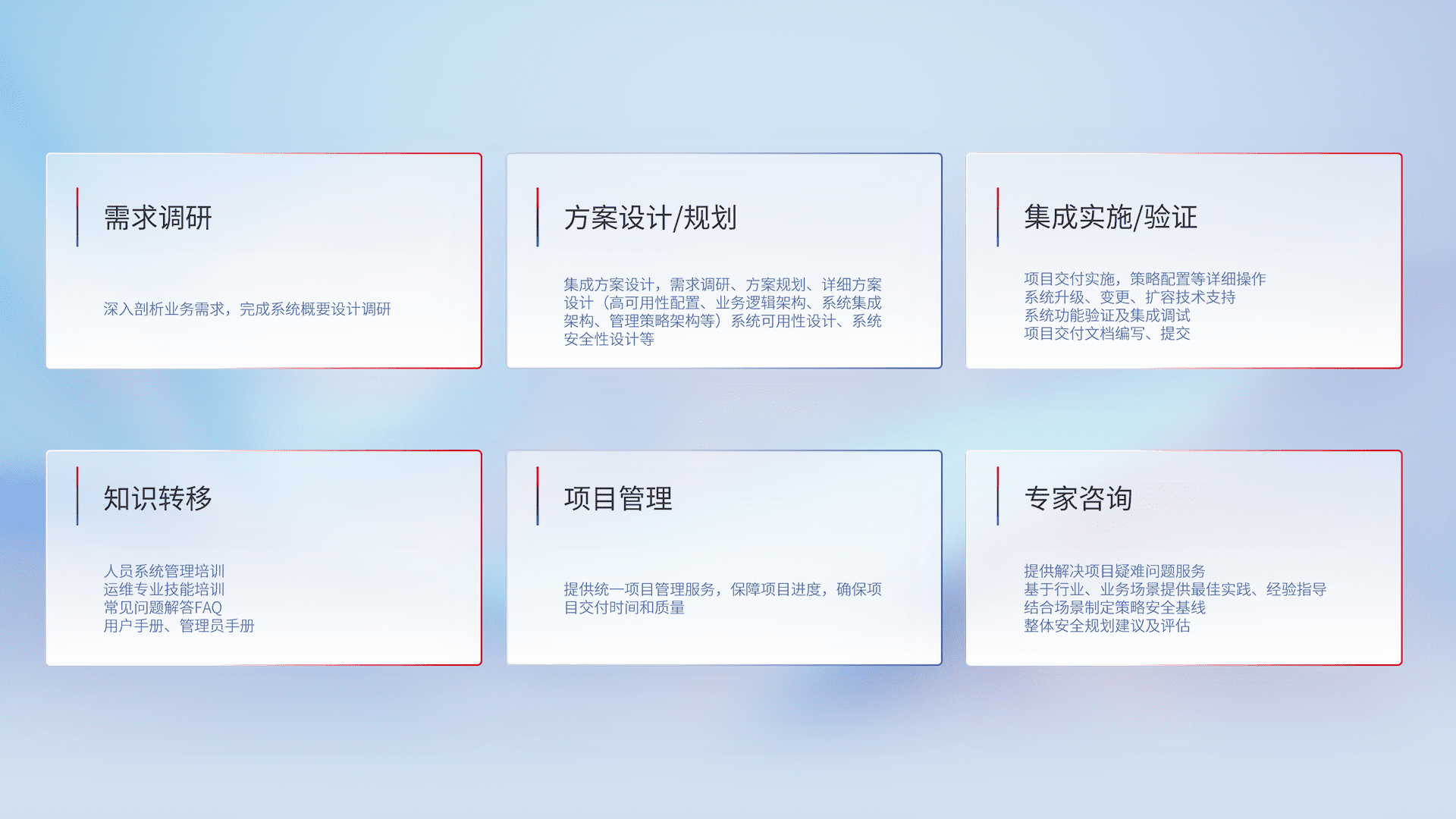 针对客户行业特性,,,将宏观的安全战略和需求,,,通过专业的交付服务,,,实现项目落地,,,为客户提供标准规范的集成交付服务。。。。